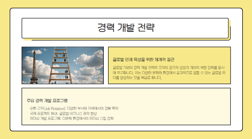 이러한 통합적 접근을 통해 기업은 글로벌 인재를 발굴, 육성하고, 궁극적으로 지속 가능한 경쟁력을 구축할 수 있습니다.