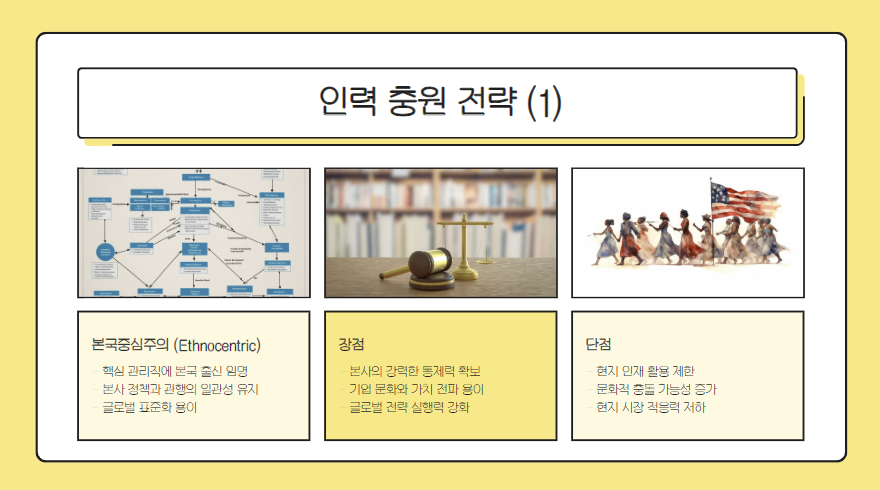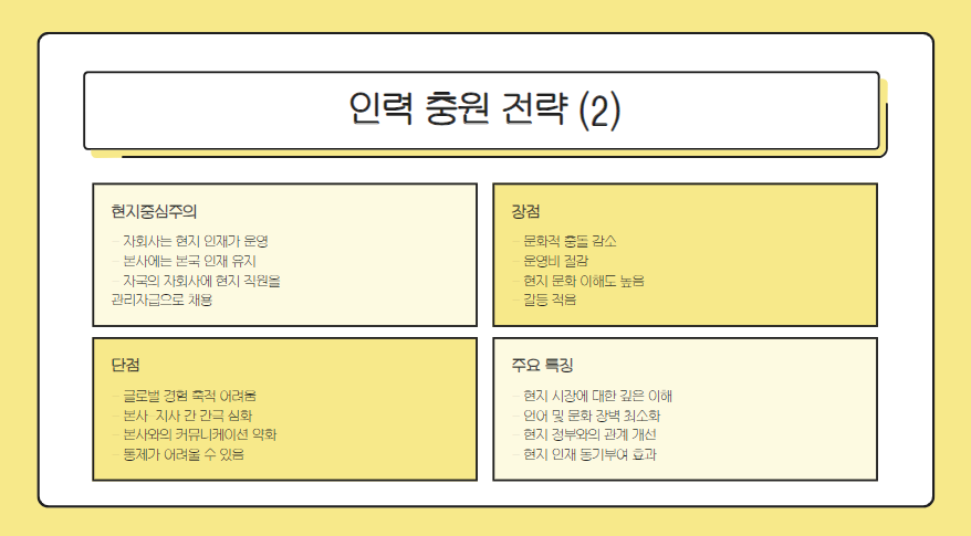 • 단점: 현지인의 승진 제한 → 반감 유발, 문화 충돌, 적응 기간 길어짐.
