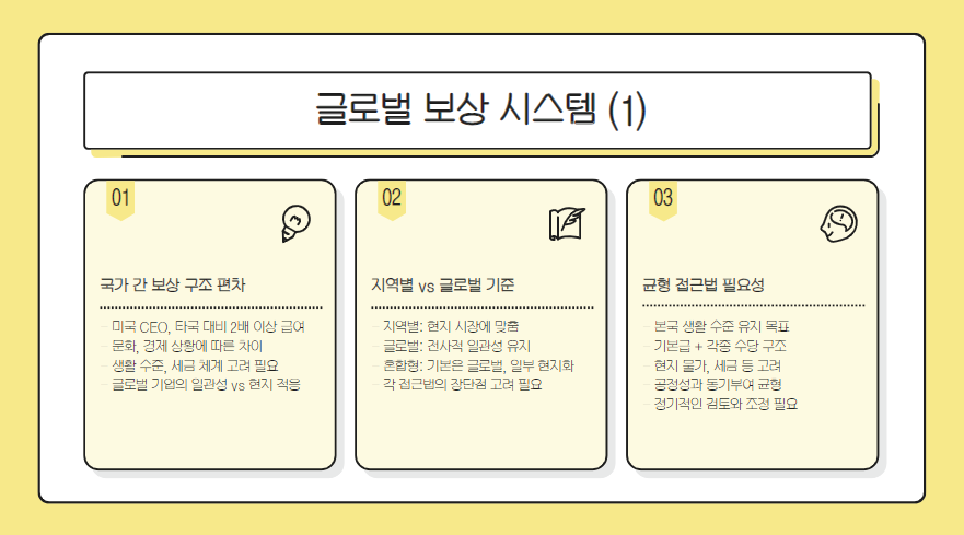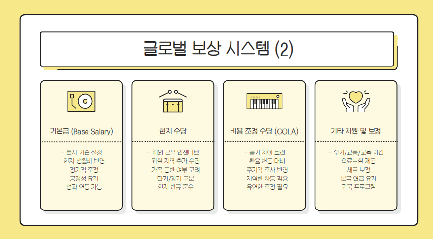 • 기본급(Base Salary): 일반적으로 본사 기준이나, 현지의 생활비에 따라 조정.