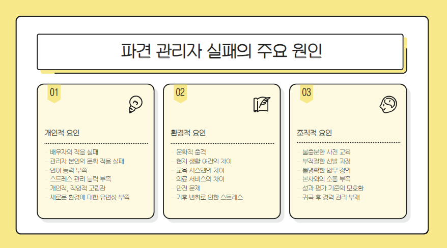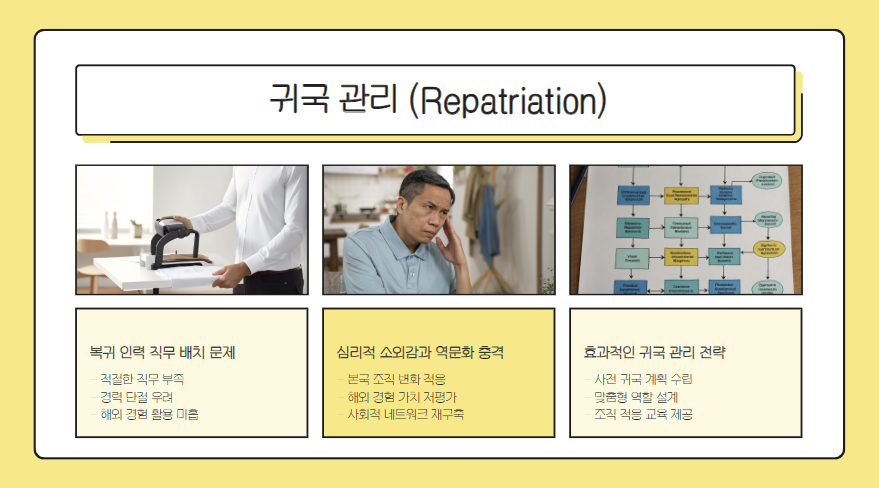 • 해결책: 사전 귀국 계획 수립, 역할 설계, 조직 적응 교육 필요