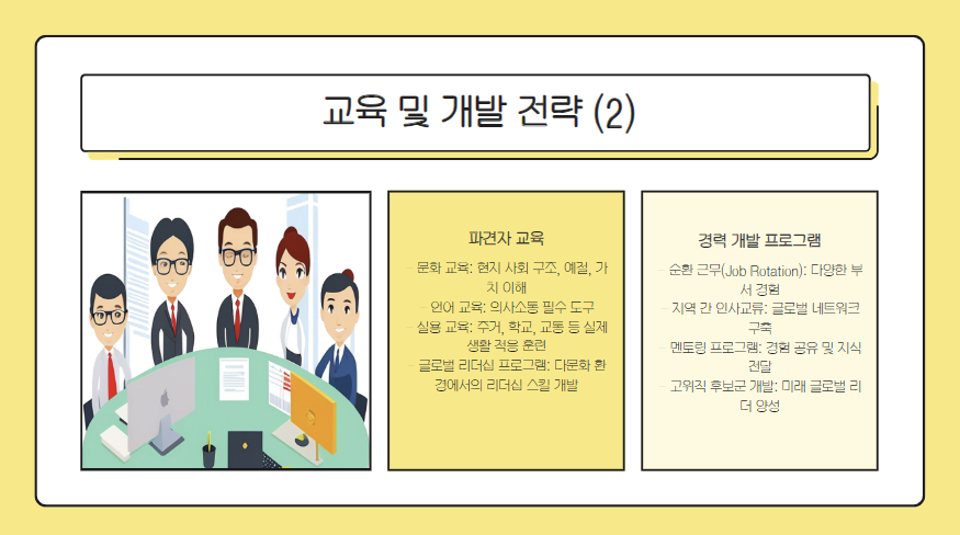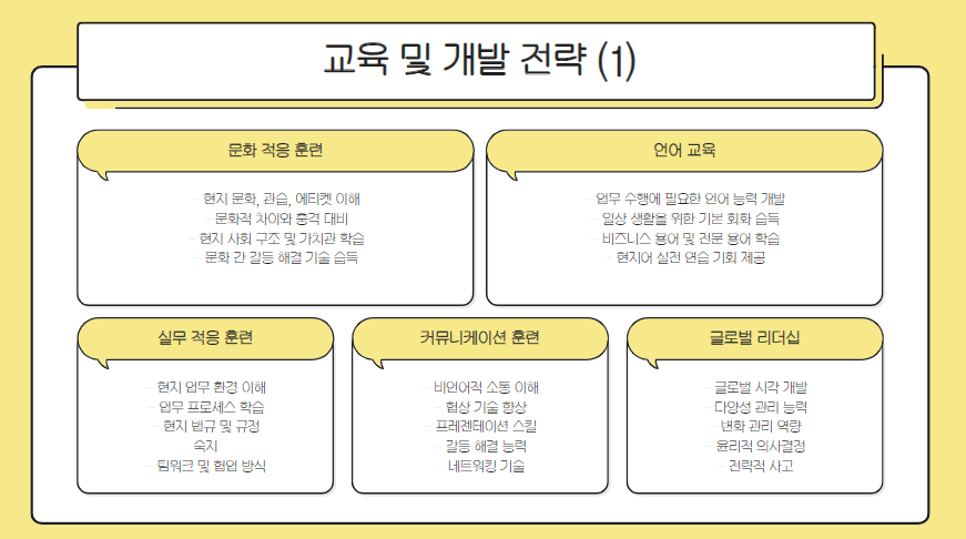 국제 기업은 파견 직원과 본사-현지 간 관리자들의 효과적인 협업을 위해 다음과 같은 교육 프로그램을 제공합니다: