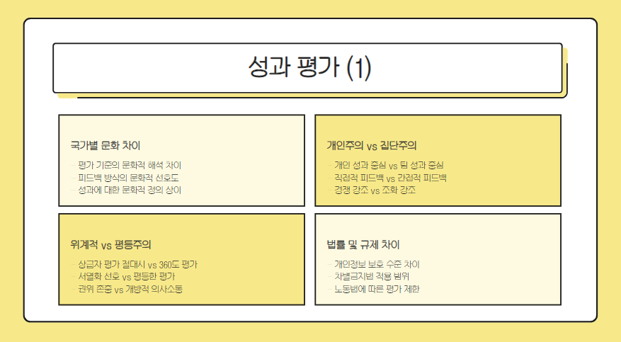 성과 평가 제도는 국가별 문화, 가치관, 법률 등에 따라 매우 달라질 수 있습니다.