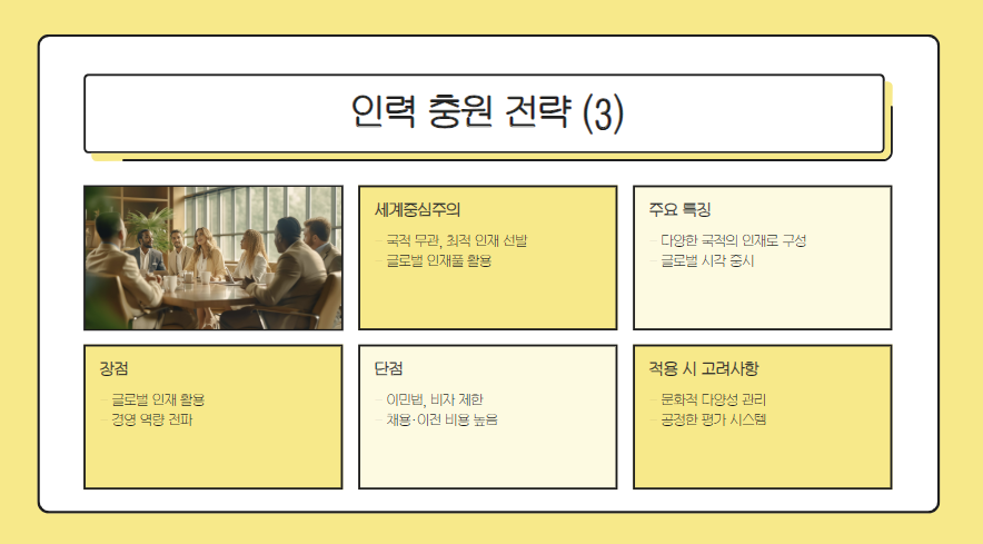 • 장점: 글로벌 인재 활용, 경영 역량 전파 가능. 진정한 글로벌 인재 풀 활용 가능.
