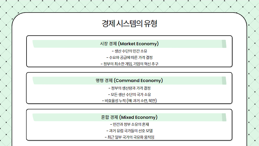 정치 이념과 경제 체제는 깊은 연관을 가집니다. 주요 경제 체제는 다음과 같이 분류됩니다: