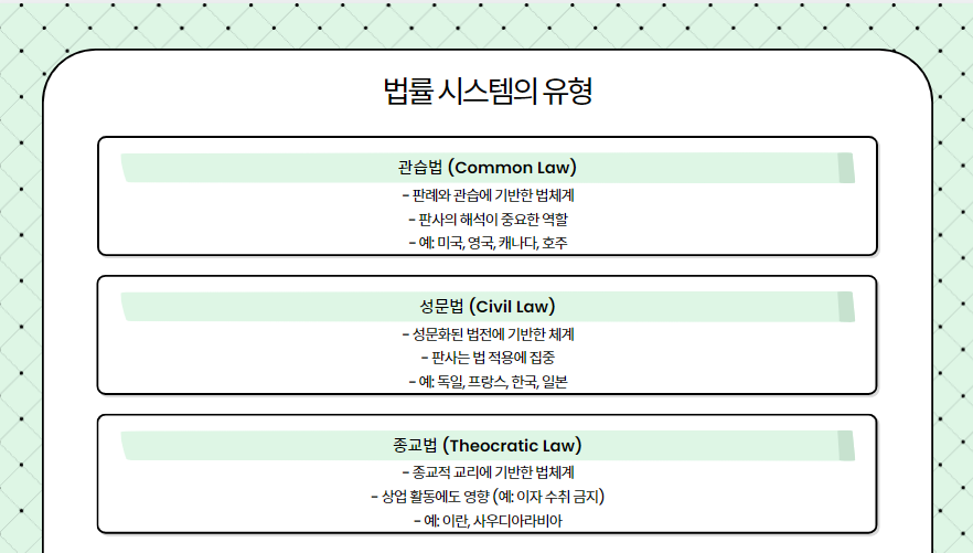 국가의 법률 시스템은 기업 활동 전반에 영향을 미칩니다. 여기에는 계약 체결 방식, 재산권 보호, 분쟁 해결 방법, 기업 설립 및 운영 규칙 등이 포함됩니다. 세 가지 주요 법 체계는 다음과 같습니다: