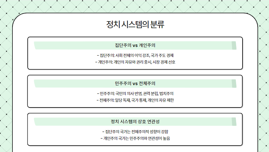 이 두 기준은 서로 연결되어 있으며, 예컨대 집단주의적인 국가는 전체주의적 성향이 강하고, 개인주의적인 국가는 민주주의로 이어지는 경향이 있습니다.