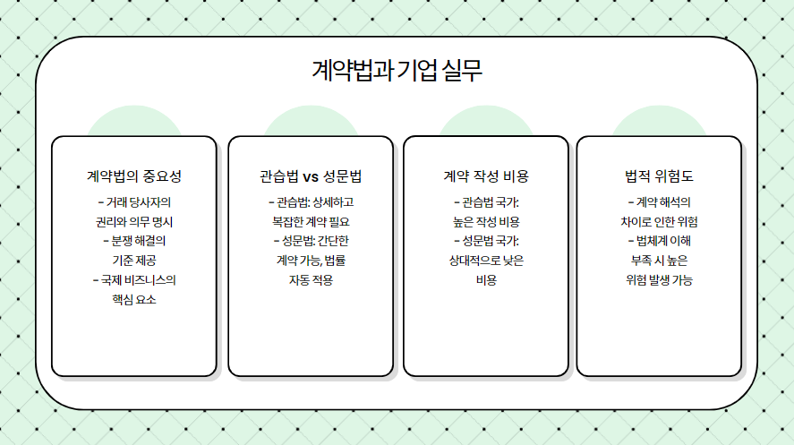 국제 비즈니스에서 ‘계약법’은 매우 중요합니다. 계약은 거래 당사자의 권리와 의무를 명시하며, 법적 분쟁 발생 시 이를 해결하는 기준이 됩니다. 각국의 법 체계에 따라 계약의 작성 방식, 유효성, 분쟁 해결 절차가 다르기 때문에 기업은 각 국가의 법률 구조를 정확히 이해하고 있어야 합니다.