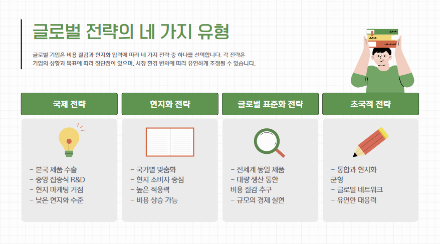 | 전략 유형 | 비용 절감 압력 | 현지화 압력 | 적합한 환경 |