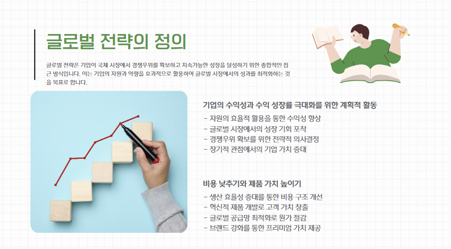 글로벌 전략(Global Strategy)이란 기업이 자원을 효과적으로 활용하여 수익성과 수익 성장률을 극대화하기 위한 일련의 계획적 활동을 말합니다.